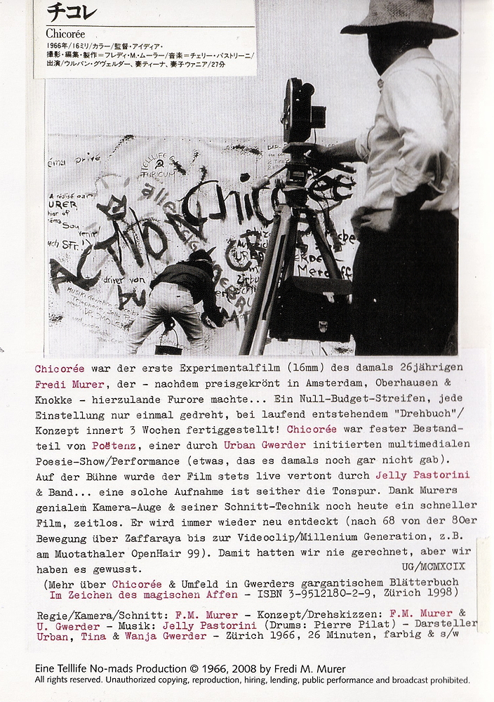 Chicorée war der erste Experimentalfilm (16mm) des damals 26jährigen Fredi Murer, der - nachdem preisgekrönt in Amsterdam, Oberhausen & Knokke hierzulande Furore machte... Ein Null-Budget-Streifen, jede Einstellung nur einmal gedreht, bei laufend entstehendem "Drehbuch"/Konzept innert 3 Wochen fertiggestellt! Chicorée war fester Bestandteil von Poetenz, einer durch Urban Gwerder initiierten multimedialen Poesie-Show/Performance (etwas, das es damals noch gar nicht gab).