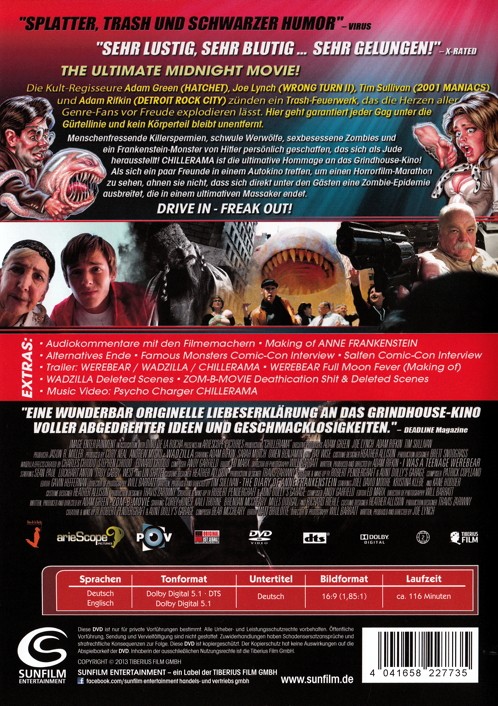Menschenfressende Killerspermien, schwule Werwölfe, sexbesessene Zombies und ein Frankenstein-Monster von Hitler persönlich geschaffen, das sich als Jude herausstellt! Chillerama ist die ultimative Hommage an das Grindhouse-Kino. Als sich ein paar Freunde in einem Autokino treffen um einen Horrorfilm-Marathon zu sehen, ahnen sie nicht, dass sich direkt unter den Gästen eine Zombie-Epidemie ausbreitet, die in einem ultimativen Massaker ende.