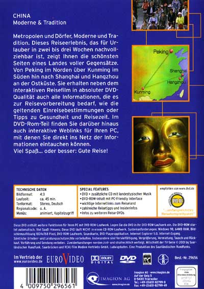 Metropolen und Dörfer, Moderne und Tradition. Dieses Reiseerlebnis, das für Urlauber in zwei bis drei Wochen nachvollziehbar ist, zeigt Ihnen die schönsten Seiten des Landes voller Gegensätze. Von Peking im Norden über Kunming im Süden hin nach Shanghai und Hangzhou an der Ostküste. Sie erhalten neben dem interaktiven Reisefilm in absoluter DVD-Qualität auch alle Informationen, die es zur Reisevorbereitung bedarf, wie die geltenden Einreisebestimmungen oder Tipps zu Gesundheit und Reisezeit. Im DVD-Rom-Teil finden Sie darüber hinaus auch interaktive Weblinks für Ihren PC, mit denen Sie direkt ins Netz der Informationen eintauchen können. Viel Spaß... oder besser: Gute Reise!