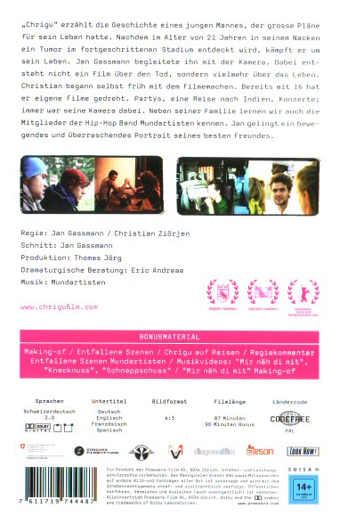 "Chrigu" erzählt die Geschichte eines jungen Mannes, der grosse Pläne für sein Leben hatte. Nachdem im Alter von 21 Jahren in seinem Nacken ein Tumor im fortgeschrittenen Stadium entdeckt wird, kämpft er um sein Leben. Jan Gassmann begleitete ihn mit der Kamera. Dabei entsteht nicht ein Film über den Tod, sondern vielmehr über das Leben. Christian begann selbst früh mit dem Filmemachen. Bereits mit 16 hat er eigene Filme gedreht. Partys, eine Reise nach Indien, Konzerte; immer war seine Kamera dabei. Neben seiner Familie lernen wir auch die Mitglieder der Hip-Hop Band Mundartisten kennen. Jan gelingt ein bewegendes und überraschendes Portrait seines besten Freundes.