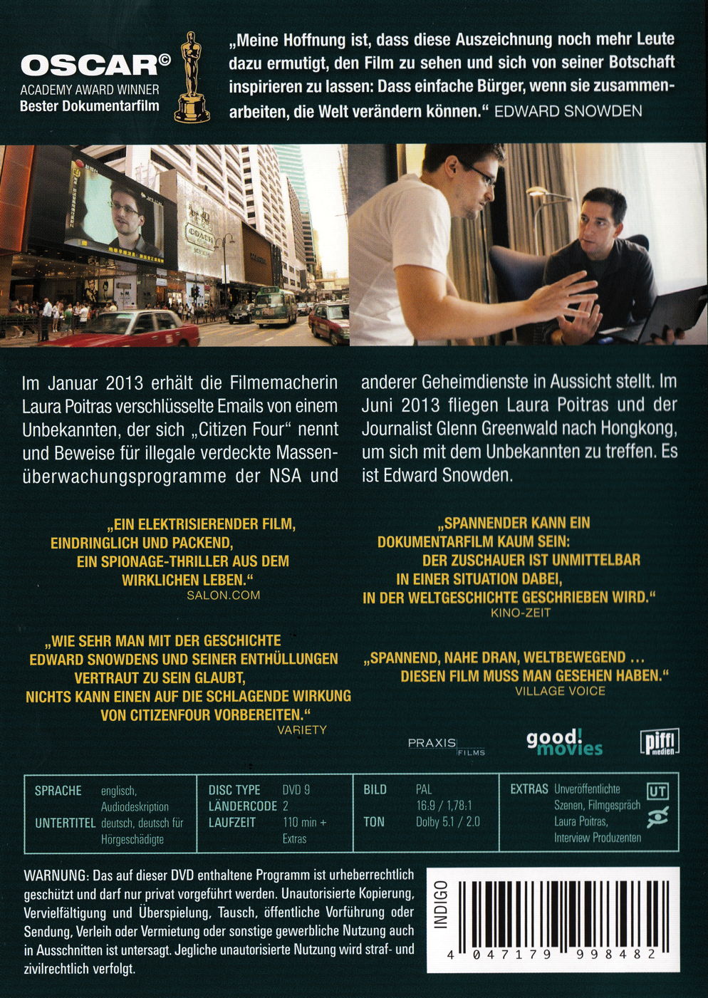 Im Januar 2013 erhält die Filmemacherin Laura Poitras, die gerade am dritten Teil ihrer vielfach preisgekrönten Trilogie über die USA nach 9/11 arbeitet, verschlüsselte Emails von einem Unbekannten, der sich "Citizen Four" nennt und Beweise für verdeckte Massenüberwachungsprogramme der NSA und anderer Geheimdienste in Aussicht stellt. Im Juni 2013 fliegen Laura Poitras und die Journalisten Glenn Greenwald und Ewen MacAskill nach Hongkong, um sich mit "Citizen Four" zu treffen - es ist Edward Snowden. Ihre Kamera hat Laura Poitras in diesen Stunden und Tagen, die unsere Welt nachhaltig verändern werden, immer dabei.