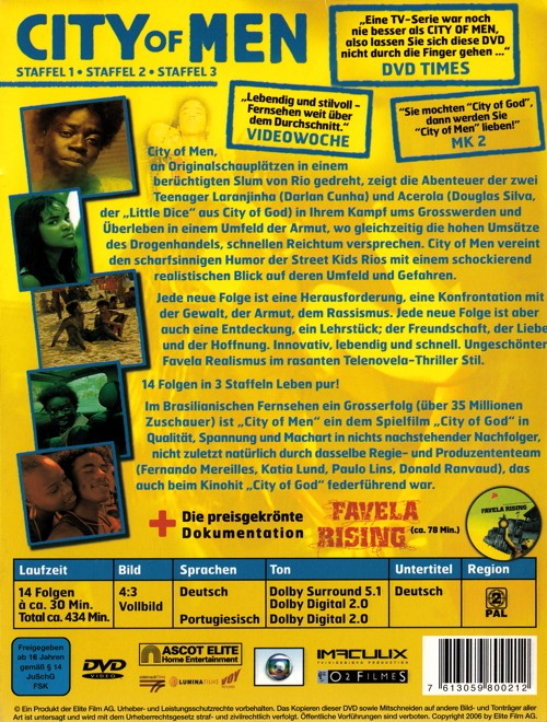 City of Men, an Originalschauplätzen in einem berüchtigten Slum von Rio gedreht, zeigt die Abenteuer der zwei Teenager Laranjinha und Acerola in ihrem Kampf ums Grosswerden und Überleben in einem Umfelt der Armut, wo gleichzeitig die hohen Umsätze des Drogenhandels, schnellen Reichtum versprechen, City of Men vereint den scharfsinnigen Humor der Street Kids Rios mit einem schockierend realistischen Blick auf deren Umfeld und Gefahren.