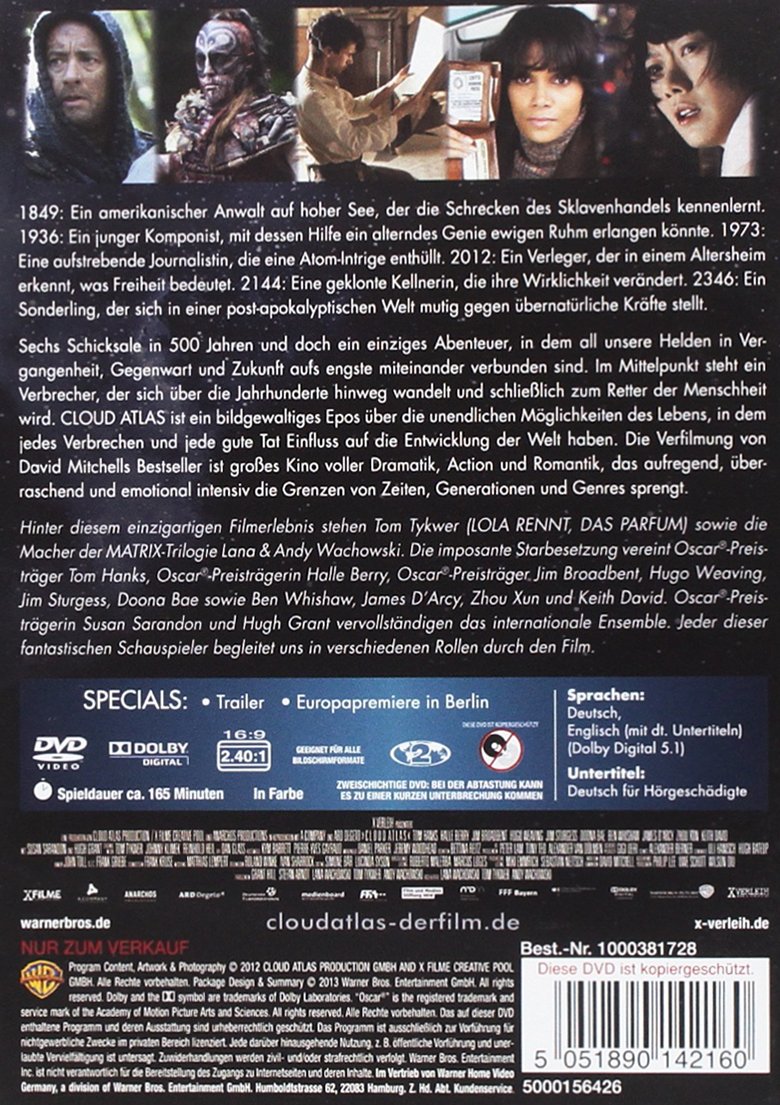 Tom Hanks, Halle Berry, Jim Broadbent, Hugo Weaving, Jim Sturgess, David Mitchell, Kym Barrett, Alexander Dülmen, Hugh Bateup, Bettina Reitz...Lora Kennedy, Philip Lee, Tom Tykwer, Frank Griebe, Daniel Parker, Alexander Berner, Pierre-Yves Gayraud, Hans-Wolfgang Jurgan, Lucinda Syson, Jeremy Woodhead, John Toll, Peter Lam, Uwe Schott, Andy Wachowski, Uli Hanisch, Grant Hill, Wilson Qiu, Tony Teo, Lana Wachowski, Stefan Arndt
