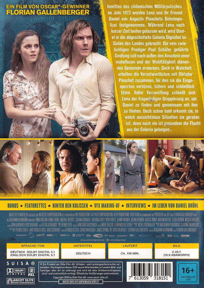 Emma Watson, Daniel Brühl, Michael Nyqvist, Richenda Carey, Vicky Krieps, Julian Ovenden, August Zirner, Martin Wuttke, César Bordón, Nicolás Barsoff...Jeanne Werner, Stefan Merki, Steve Karier, Alexia Moyano, Éric Gigout, Marcelo Vilaro, Cuco Wallraff, Rouven Blessing, Oscar Ali Garci, Gilles Soeder, Lucila Gandolfo, Katharina Müller-Elmau, Paul Herwig, Johannes Allmayer, Herbert Forthuber