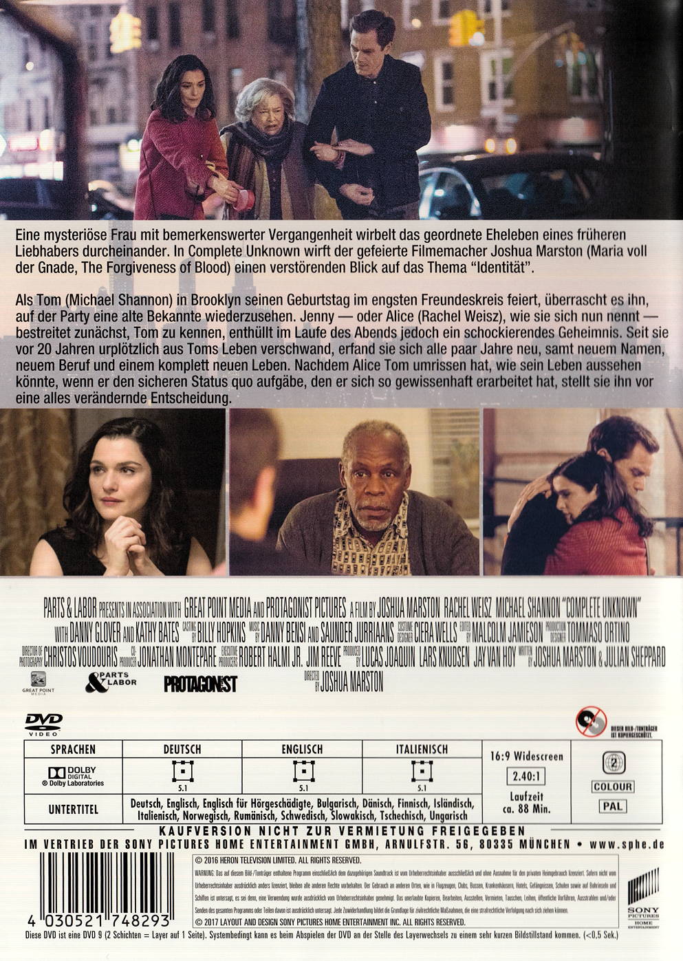 Eine mysteriöse Frau mit bemerkenswerter Vergangenheit wirbelt das geordnete Eheleben eines früheren Liebhabers durcheinander. In Complete Unknown wirft der gefeierte Filmemacher Joshua Marston einen verstörenden Blick auf das Thema Identität. Als Tomin Brooklyn seinen Geburtstag im engsten Freundeskreis feiert, überrascht es ihn, auf der Party eine alte Bekannte wiederzusehen. Jenny - oder Alice, wie sie sich nun nennt - bestreitet zunächst, Tom zu kennen, enthüllt im Laufe des Abends jedoch ein schockierendes Geheimnis. Seit sie vor 20 Jahren urplötzlich aus Toms Leben verschwand, erfand sie sich alle paar Jahre neu, samt neuem Namen, neuem Beruf und einem komplett neuen Leben. Nachdem Alice Tom umrissen hat, wie sein Leben aussehen könnte, wenn er den sicheren Status quo aufgäbe, den er sich so gewissenhaft erarbeitet hat, stellt sie ihn vor eine alles verändernde Entscheidung.