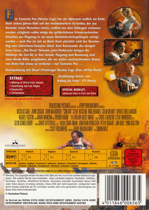 Für Cameron Poe (Nicholas Cage) hat der Albtraum endlich ein Ende: Nach sieben Jahren Haft soll der hochdekorierte Ex-Soldat, der aus Notwehr einen Menschen tötete, endlich aus dem Gefängnis entlassen werden. Zeitgleich sollen einige der gefährlichsten Schwerverbrecher Amerikas per Flugzeug in ein neues Hochsicherheitsgefängnis verlegt werden - auch Poe ist mit an Bord. Doch plötzlich wird der Routineflug zum Schreckens-Szenario. Unter dem Kommando des skrupellosen Cyrus "The Virus" Grissom (John Malkovich) bringen die Häftlinge die Con Air in ihre Gewalt. Flugzeug und Besatzung sind einer Horde Killer ausgeliefert, die vor nichts zurückschrecken. Keiner von ihnen hat etwas zu verlieren - nur Cameron Poe...