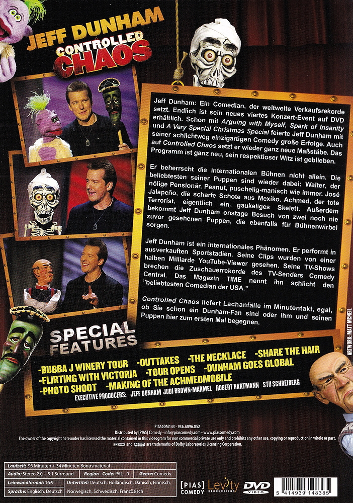 Seine Fernsehspecials und Serien sind die Quotenhits auf Comedy Central. Er hat 7 Millionen DVDs verkauft. Eine halbe Milliarde Zuschauer haben auf You Tube seine Videos angeklickt. Seine Live-Konzerte ähneln Mega-Events: Jeff Dunham performt in ausverkauften Stadien in der ganzen Welt. Kein Wunder das ihn das TIME Magazin als beliebtesten Comedian der USA beschreibt und ihn das FORBES Magazin schon im zweiten Jahr in Folge auf seine Celebrity-Liste der 100 einflussreichsten Entertainer setzte. Jeff Dunham ist ein weltweit erfolgreiches Unterhaltungsphänomen mit einer unverwechselbaren Persönlichkeit. So ganz ohne Hilfe ging das natürlich nicht. Auf der Bühne stehen neben ihm noch andere Persönlichkeiten, die ihn nach Strich und Faden fertig machen. Walter, der maulige Pensionär. Bubba J, der erzkonservative biersaufende Hinterwäldler und NASCAR-Fan. Der puschelig-manische Peanut. José Jalapeño, die scharfe Schote aus Mexiko. Achmed, der tote Terrorist und ein gaukeliges Skelett. Alle diese Figuren entspringen der Fantasie von Jeff Dunham, der sie auch sämtlich von Hand gebaut hat. Trotzdem haben sie alle ein Eigenleben und längst massenweise eigenen Fans.