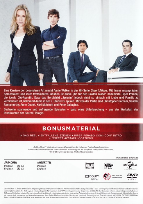 Eine Karriere der besonderen Art macht Annie Walker in der Hit-Serie Covert Affairs: Mit ihrem ausgeprägten Sprachtalent und ihrer treffsicheren Intuition ist Annie die ideale CIA-Agentin. Dass das Berufsbild "Spionin" jedoch nicht so einfach mit Liebe und Familie zu vereinbaren ist, bekommt Annie in der 2. Staffel zu spüren. Mit von der Partie sind Christopher Gorham, Sendhil Ramamurthy, Anne Dudek, Kari Matchett und Peter Gallagher.