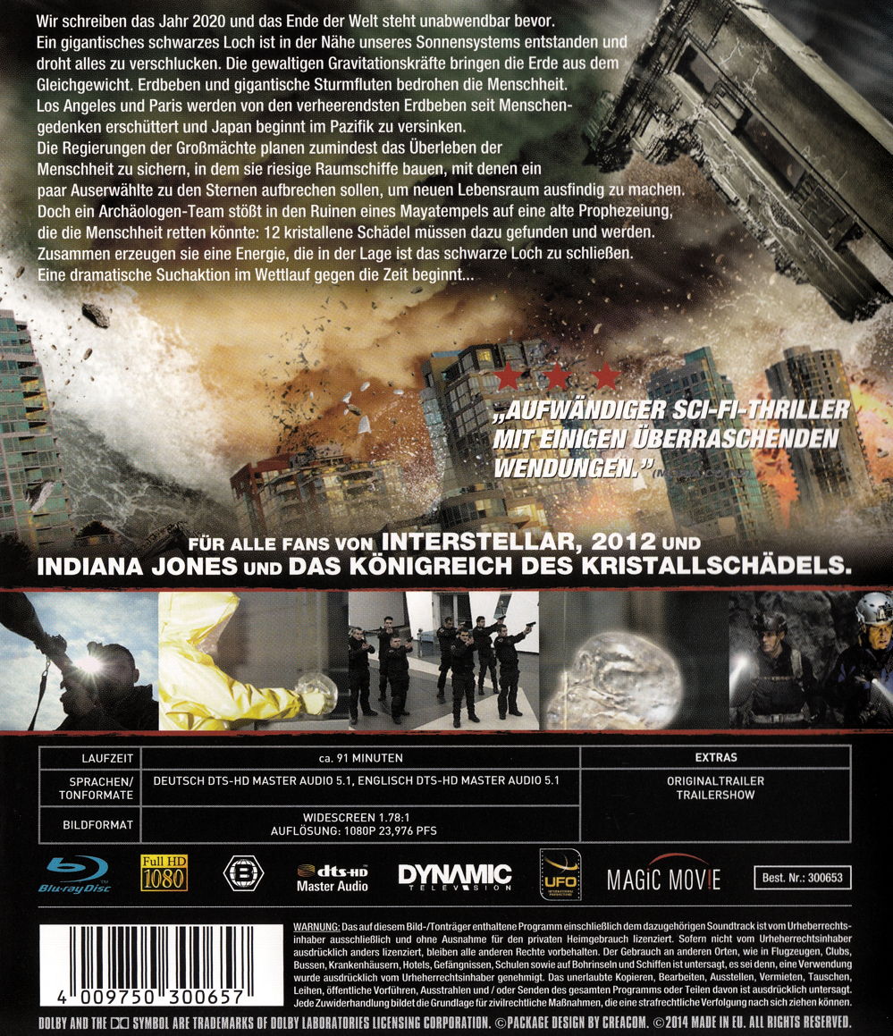 Wir schreiben das Jahr 2020 und das Ende der Welt steht unabwendbar bevor. Ein gigantisches schwarzes Loch ist in der Nähe unseres Sonnensystems entstanden und droht alles zu verschlucken. Die gewaltigen Gravitationskräfte bringen die Erde aus dem Gleichgewicht. Erdbeben und gigantische Sturmfluten bedrohen die Menschheit. Los Angeles und Paris werden von den verheerendsten Erdbeben seit Menschengedenken erschüttert und Japan beginnt im Pazifik zu versinken. Die Regierungen der Grossmächte planen zumindest das Überleben der Menschheit zu sichern, indem sie riesige Raumschiffe bauen, mit denen ein paar Auserwählte zu den Sternen aufbrechen sollen, um neuen Lebensraum ausfindig zu machen. Doch ein Archäologen-Team stösst in den Ruinen eines Mayatempels auf eine alte Prophezeiung, die die Menschheit retten könnte: 12 kristallene Schädel müssen gefunden werden. Zusammen erzeugen sie eine Energie, die in der Lage ist, das schwarze Loch zu schliessen. Eine dramatische Suchaktion im Wettlauf gegen die Zeit beginnt...