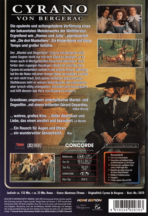 Bauchaufschlitzer und Schädelknacker, nicht auf den Mund gefallen, mit einem stolzen und edlen Herzen. Das ist er, das ist unser Mann. Ein brillianter Fechter, verliebt in das Rasseln der Stahlklingen. Er nimmt es auf mit Spott, mit Provokation und Gefahr, mit jedem Feind. Und doch, unter seinem Brustpanzer verbirgt er eine geheime Wunde, die ihn immer wieder quält. Er ist unansehnlich und fürchtet sich, geliebt zu werden. Und doch, er konnte nicht umhin, sich in die schönste aller Frauen zu verlieben - Roxanne. Sein Schicksal ist besiegelt. Das ist seine härteste Schlacht, die grausamste, der er sich stellte...