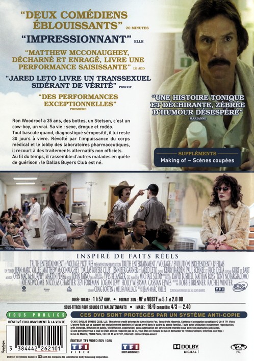 1986, Dallas, Texas, une histoire vraie. Ron Woodroof a 35 ans, des bottes, un Stetson, c’est un cow-boy, un vrai. Sa vie : sexe, drogue et rodéo. Tout bascule quand, diagnostiqué séropositif, il lui reste 30 jours à vivre. Révolté par l’impuissance du corps médical, il recourt à des traitements alternatifs non officiels. Au fil du temps, il rassemble d’autres malades en quête de guérison : le Dallas Buyers Club est né. Mais son succès gêne, Ron doit s’engager dans une bataille contre les laboratoires et les autorités fédérales. C’est son combat pour une nouvelle cause... et pour sa propre vie.