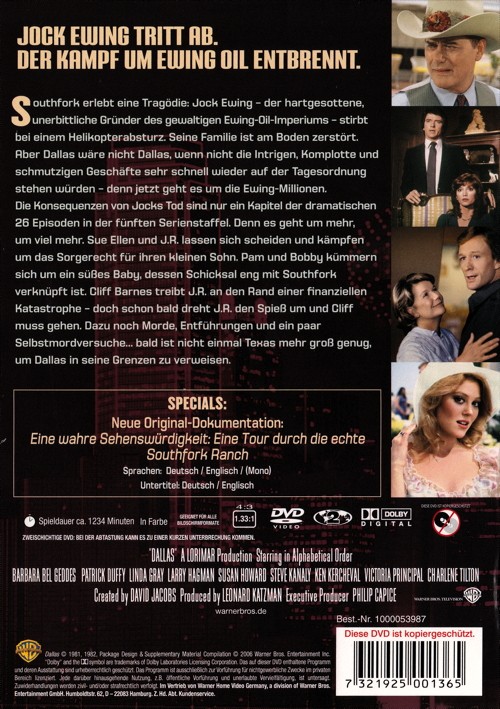 Southfork erlebt eine Tragödie: Jock Ewing - der hartgesottene, unerbittliche Gründer des gewaltigen Ewing-Oil-Imperiums - stirbt bei einem Helikopterabsturz. Seine Familie ist am Boden zerstört. Aber Dallas wäre nicht Dallas, wenn nicht die Intrigen, Komplotte und schmutzigen Geschäfte sehr schnell wieder auf der Tagesordnung stehen würden - denn jetzt geht es um die Ewing-Millionen. Die Konsequenzen von Jocks Tod sind nur ein Kapitel der dramatischen 26 Episoden in der fünften Serienstaffel. Denn es geht um mehr, um viel mehr. Sue Ellen und J.R. lassen sich scheiden und kämpfen um das Sorgerecht für ihren kleinen Sohn. Pam und Bobby kümmern sich um ein süsses Baby, dessen Schicksal eng mit Southfork verknüpft ist. Cliff Barnes treibt J.R. an den Rand einer finanziellen Katastrophe - doch schon bald dreht J.R. den Spiess um und Cliff muss gehen. Dazu noch Morde, Entführungen und ein paar Selbstmordversuche... bald ist nicht einmal Texas mehr gross genug, um Dallas in seine Grenzen zu verweisen.