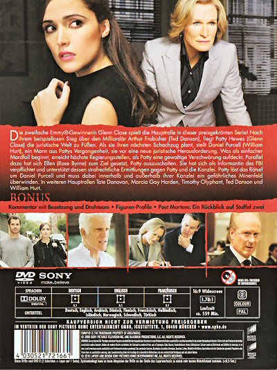 Die zweifache Emmy-Gewinnerin Glenn Close spielt die Hauptrolle in dieser preisgekrönten Serie: Nach ihrem beispiellosen Sieg über den Milliardär Arthur Frobisher (Ted Danson), liegt Patty Hewes (Glenn Close) die juristische Welt zu Füssen. Als sie ihren nächsten Schachzug plant, stellt Daniel Purcell (William Hurt), ein Mann aus Pattys Vergangenheit, sie vor eine neue juristische Herausforderung. Was als einfacher Mordfall beginnt, erreicht höchste Regierungsstellen, als Patty eine gewaltige Verschwörung aufdeckt. Parallel dazu hat sich Ellen (Rose Byrne) zum Ziel gesetzt, Patty auszuschalten. Sie hat sich als Informantin des FBI verpflichtet und unterstützt dessen strafrechtliche Ermittlungen gegen Patty und die Kanzlei. Patty löst das Rätsel um Daniel Purcell und muss dabei innerhalb und ausserhalb ihrer Kanzlei ein gefährliches Minenfeld überwinden.