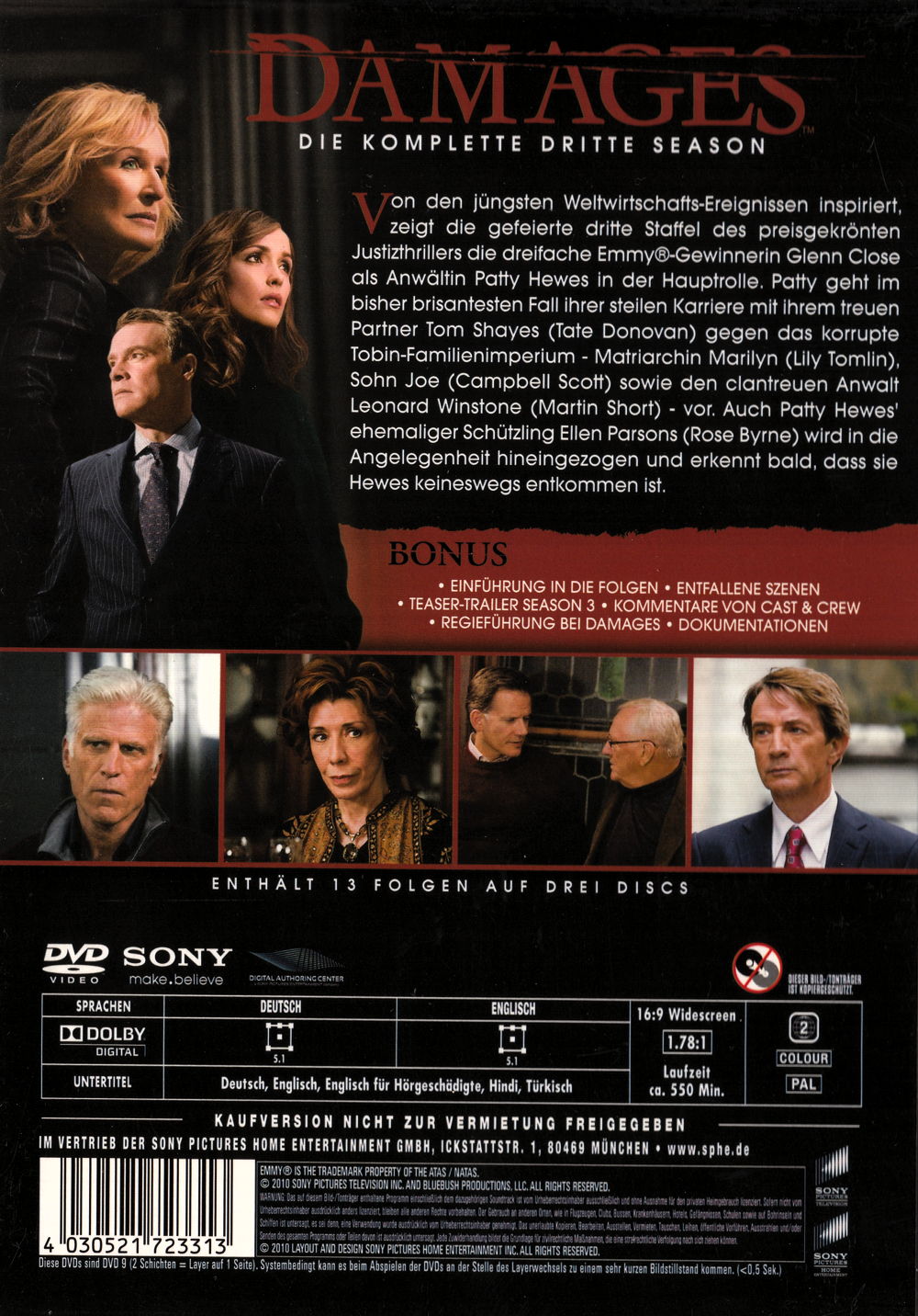 Von den jüngsten Weltwirtschafts-Ereignissen inspiriert, zeigt die gefeierte dritte Staffel des preisgekrönten Justizthrillers die dreifache Emmy[r]-Gewinnerin Glenn Close als Anwältin Patty Hewes in der Hauptrolle. Patty geht im bisher brisantesten Fall ihrer steilen Karriere mit ihrem treuen Partner Tom Shayes (Tate Donovan) gegen das korrupte Tobin-Familienimperium - Matriarchin Marilyn (Lily Tomlin), Sohn Joe (Campbell Scott) sowie der clantreue Anwalt Leonard Winstone (Martin Short) - vor. Auch Patty Hewes' ehemaliger Schützling Ellen Parsons (Rose Byrne) wird in die Angelegenheit hineingezogen und erkennt bald, dass sie Hewes keineswegs entkommen ist.