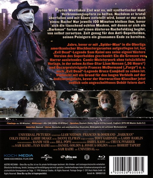 Der Wissenschaftler Dr. Peyton Weston arbeitet an der Entwicklung einer synthetischen Haut. Als Gangster sein Labor in die Luft sprengen, wird er schwer verletzt. Zwar rettet eine Gehirnoperation sein Leben, doch danach ist er nicht mehr derselbe. Dr. Peyton ist tot, Darkman lebt. Ein Schattengeschöpf mit tausend Gesichtern, gnadenloses Monster im Dunkel. In ihm brennt die Wut auf das Böse, das sein Leben zerstört hat. Das Phantom der Rache...