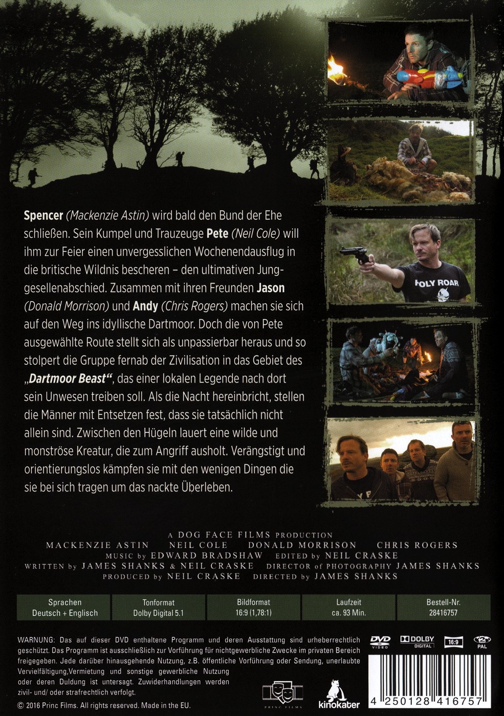 Spencer wird bald den Bund der Ehe schliessen. Sein Kumpel und Trauzeuge Pete will ihm zur Feier einen unvergesslichen Wochenendausflug in die britische Wildnis bescheren den ultimativen Junggesellenabschied. Zusammen mit ihren Freunden Jason und Andy machen sie sich auf den Weg ins idyllische Dartmoor. Doch die von Pete ausgewählte Route stellt sich als unpassierbar heraus und so stolpert die Gruppe fernab der Zivilisation in das Gebiet des Dartmoor Beast , das einer lokalen Legende nach dort sein Unwesen treiben soll. Als die Nacht hereinbricht, stellen die Männer mit Entsetzen fest, dass sie tatsächlich nicht allein sind. Zwischen den Hügeln lauert eine wilde und monströse Kreatur, die zum Angriff ausholt. Verängstigt und orientierungslos kämpfen sie sich mit den wenigen Dingen die sie bei sich tragen um das nackte Überleben.