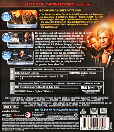 Sie sind clever, cool und unberechenbar, sie sind das "A-Team"! Als Teil einer militärischen Spezialeinheit erledigen der Stratege Hannibal (Liam Neeson), Frauenheld Faceman (Bradley Cooper), der irre Pilot Murdock (Sharlto Copley) und Muskelprotz B.A. (Quinton "Rampage" Jackson) gefährliche Missionen, bis sie während eines Einsatzes aufs Kreuz gelegt und verurteilt werden. Doch dem Quartett gelingt die spektakuläre Flucht aus dem Gefängnis. Gnadenlos gejagt von CIA und Militär begeben sie sich auf die rasante Suche nach den wahren Drahtziehern des Komplotts und erledigen nebenbei noch ein paar gefährliche Jobs. Heisse Action, spektakuläre Effekte und coole Sprüche - dieses Team lässt es richtig krachen und hat garantiert immer einen Plan!