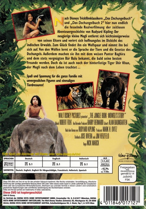 Nach Disneys Trickfilmklassikern "Das Dschungelbuch" und "Das Dschungelbuch 2" hier nun endlich die fesselnde Realverfilmung der zeitlosen Abenteuergeschichte von Rudyard Kipling: Der neugierige kleine Mogli entfernt sich leichtsinnigerweise von seinen Eltern und verirrt sich hoffnungslos im Dickicht des indischen Urwalds. Zum Glück findet ihn ein Wolfspaar und nimmt ihn bei sich auf. Von den Wölfen lernt er die Sprache der Tiere und die Gesetze des Dschungels. Ausserdem machen sie ihn mit dem weisen Panter Baghira und dem stets vergnügten Bär Balu bekannt, die bald seine besten Freunde werden. Doch da ist auch noch der hinterlistige Tiger Shir Khan, der Mogli nach dem Leben trachtet...