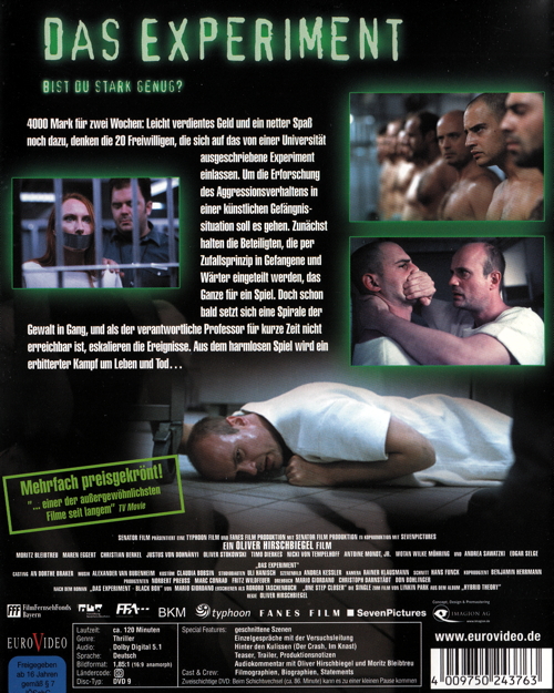 4000 Mark für zwei Wochen: Leicht verdientes Geld und ein netter Spass noch dazu, denken die 20 Freiwilligen, die sich auf das von einer Universität ausgeschriebene Experiment einlassen. Um die Erforschung des Aggressionsverhaltens in einer künstlichen Gefängnissituation soll es gehen. Zunächst halten die Beteiligten, die per Zufallsprinzip in Gefangene und Wärter eingeteilt werden, das Ganze für ein Spiel. Doch schon bald setzt sich eine Spirale der Gewalt in Gang, und als der verantwortliche Professor für kurze Zeit nicht erreichbar ist, eskalieren die Ereignisse. Aus dem harmlosen Spiel wird ein erbitterter Kampf auf Leben und Tod...