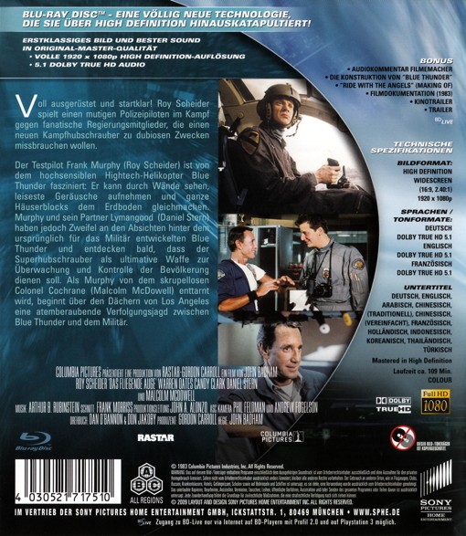 Über dem Smog-verseuchten Los Angeles kreist Frank Murphy (Roy Scheider) mit seinem Hubschrauber "Blue Thunder", um von der Luft aus für "Ordnung" in der Stadt zu sorgen. Die Maschine ist mit allermodernster Überwachungstechnik und sechs 20mm Bordkanonen ausgerüstet.