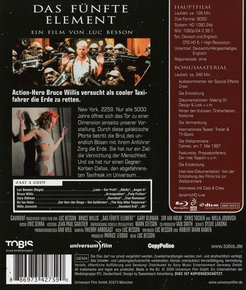 New York, 2259. Nur alle 5000 Jahre öffnet sich das Tor zur Dimension jenseits unserer Vorstellung. Durch diese galaktische Pforte betritt die Brut des unendlich Bösen mit ihrem Anführer Zorg die Erde. Sie hat nur ein Ziel: die Vernichtung der Menschheit. Sie hat nur einen Gegner: Korben Dallas, den abgefahrensten Taxifreak im Universum...