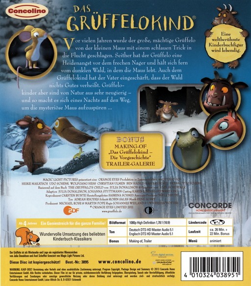 Vor vielen Jahren wurde der grosse, mächtige Grüffelo von der kleinen Maus mit einem schlauen Trick ins Bockshorn gejagt. Seither hat er eine Heidenangst vor dem frechen Nager und hält sich fern vom dunklen Wald, in dem die Maus lebt. Auch dem Grüffelokind hat der Vater eingeschärft, dass der Wald nichts Gutes verheisst - Grüffelokinder aber sind neugierig, und eines Nachts macht es sich auf den Weg, um die mysteriöse Maus aufzuspüren...