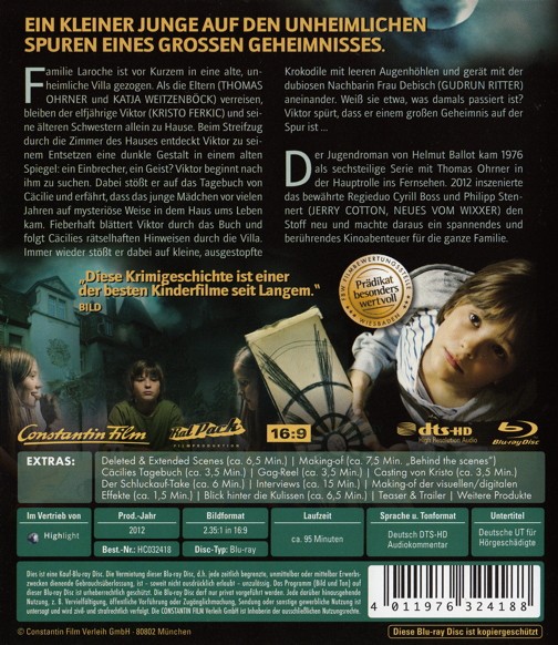 Familie Laroche wohnt in einer alten, unheimlichen Villa. Als die Eltern (Thomas Ohrner und Katja Weitzenböck) im Urlaub sind, ist der elfjährige Viktor (Kristo Ferkic) mit seinen älteren Schwestern Cora (Joanna Ferkic) und Louise (Vijessna Ferkic) allein zuhause. Beim Streifzug durch die alten Zimmer entdeckt der Junge zwischen verstaubten Umzugskartons und uralten afrikanischen Masken ein kleines, ausgestopftes Krokodil mit leeren Augenhöhlen. Aus dem dämmrigen Licht im Raum dringt nur das leise Ticken einer alten Standuhr. Plötzlich erstarrt Viktor mit schreckgeweiteten Augen vor einem grossen Spiegel: Hinter ihm huscht eine dunkle Gestalt durch die Wohnung. Ein Einbrecher, ein Geist? Viktor beginnt panisch nach ihm zu suchen. Dabei stösst er im "verbotenen Zimmer" auf das Tagebuch von Cäcilie. Das junge Mädchen ist vor vielen Jahren auf mysteriöse Weise in dem Haus ums Leben gekommen. Fasziniert blättert Viktor durch das Buch und folgt Cäcilies rätselhaften Hinweisen durch die Villa. Dabei macht ihm die seltsame Frau Debisch (gudrun Ritter) von nebenan mit ihrem Sohn Friedrich (Christoph Maria Herbst) ständig einen Strich durch die Rechnung. Und auch der zwielichtige Nachbar Strichninsky (Waldemar Kobus) benimmt sich merkwürdig. Haben sie etwas mit Cäcilies Tod zu tun? Viktor spürt, dass er einem grossen Geheimnis auf der Spur ist...
