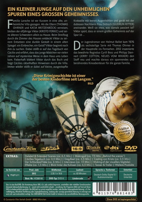 Familie Laroche wohnt in einer alten, unheimlichen Villa. Als die Eltern (Thomas Ohrner und Katja Weitzenböck) im Urlaub sind, ist der elfjährige Viktor (Kristo Ferkic) mit seinen älteren Schwestern Cora (Joanna Ferkic) und Louise (Vijessna Ferkic) allein zuhause. Beim Streifzug durch die alten Zimmer entdeckt der Junge zwischen verstaubten Umzugskartons und uralten afrikanischen Masken ein kleines, ausgestopftes Krokodil mit leeren Augenhöhlen. Aus dem dämmrigen Licht im Raum dringt nur das leise Ticken einer alten Standuhr. Plötzlich erstarrt Viktor mit schreckgeweiteten Augen vor einem grossen Spiegel: Hinter ihm huscht eine dunkle Gestalt durch die Wohnung. Ein Einbrecher, ein Geist? Viktor beginnt panisch nach ihm zu suchen. Dabei stösst er im "verbotenen Zimmer" auf das Tagebuch von Cäcilie. Das junge Mädchen ist vor vielen Jahren auf mysteriöse Weise in dem Haus ums Leben gekommen. Fasziniert blättert Viktor durch das Buch und folgt Cäcilies rätselhaften Hinweisen durch die Villa. Dabei macht ihm die seltsame Frau Debisch (gudrun Ritter) von nebenan mit ihrem Sohn Friedrich (Christoph Maria Herbst) ständig einen Strich durch die Rechnung. Und auch der zwielichtige Nachbar Strichninsky (Waldemar Kobus) benimmt sich merkwürdig. Haben sie etwas mit Cäcilies Tod zu tun? Viktor spürt, dass er einem grossen Geheimnis auf der Spur ist...