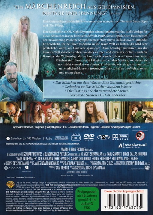 Paul Giamatti spielt einen Hausmeister, der im Swimming-Pool eine Nymphe namens Story entdeckt. Er beschliesst, ihr bei ihrer Rückkehr in die Blaue Welt zu helfen. "Es wird sehr gefährlich", warnt sie. Und sehr spannend! Denn bösartige Kreaturen aus der fremden Welt streichen umher, um Story zu töten und jeden, der ihr hilft - auch die Bewohner der Wohnanlage, die nach und nach begreifen, dass sie Figuren aus einem Märchen sind. Story weckt Fähigkeiten bei den Mietern, von denen sie noch nicht einmal etwas ahnten. Erleben sie, wie sie gemeinsam den unheimlichen Monstern trotzen, um ihr Schicksal zu erfüllen, erzählt die wunderliche Geschichte der Lady in the Water.