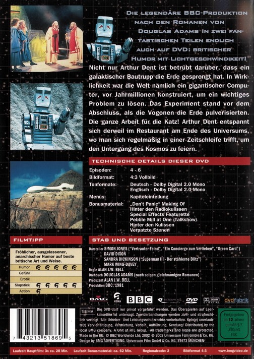 Nicht nur Arthur Dent ist betrübt darüber, daß ein galaktischer Bautrupp die Erde gesprengt hat. In Wirklichkeit war die Welt nämlich ein gigantischer Computer vor Jahrmillionen konstruiert, um ein wichtiges Problem zu lösen. Das Experiment stand vor dem Abschluß, als die Vogonen die Erde pulverisierten. Die ganze Arbeit für die Katz! Arthur Dent entspannt sich derweil im Restaurant am Ende des Universums, wo man sich regelmäßig in einer Zeitschleife trifft, um den Untergang des Kosmos zu feiern. Die legendäre BBC - Produktion nach Douglas Adams' Roman: britischer Humor mit Lichtgeschwindigkeit.