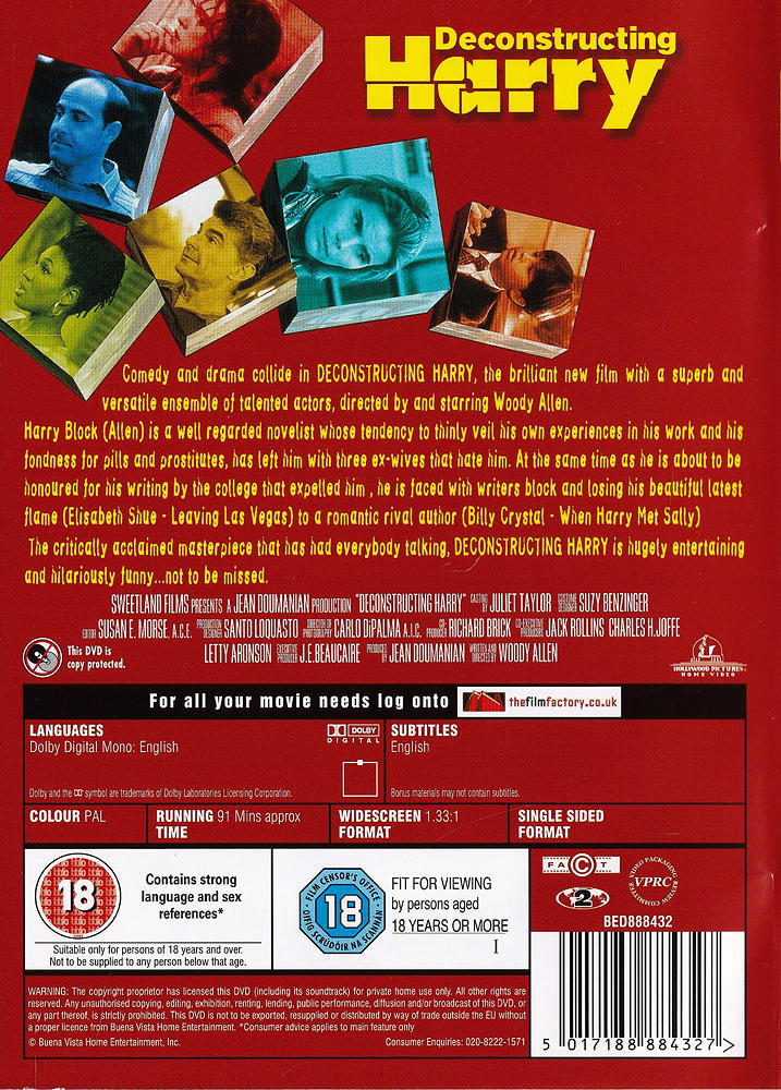 Comedy and drama collide in DECONSTRUCTING HARRY, the brilliant new film with a superb and versatile ensemble of talented actors, directed by and starring Woody Allen.