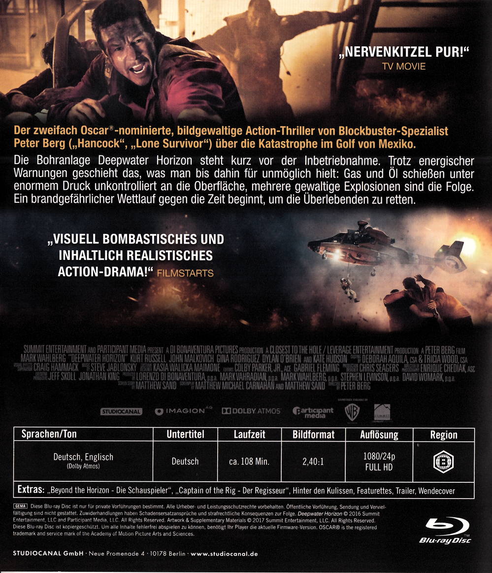 2010 steht die Ölbohranlage "Deepwater Horizon" kurz vor einem bahnbrechenden Rekord. Über 100 Millionen Barrel Öl sollen 70 Kilometer von der US-Küste entfernt aus dem Golf von Mexiko gefördert werden. Das Team um die beiden Chef-Techniker Mike Williams und Jimmy Harrell ist beauftragt, die Förderung vorzubereiten, doch ein Test zeigt, dass der Druck auf das Bohrloch viel zu hoch ist. Trotz energischer Warnungen seitens der Crew geschieht, was man im BP-Konzern bis dahin für unmöglich hielt: Es kommt zu einen "Blowout", Gas und Öl schiessen unter enormem Druck unkontrolliert an die Oberfläche, mehrere gewaltige Explosionen sind die Folge. Über 120 Menschen sind plötzlich auf der Plattform eingeschlossen. Millionen Tonnen Öl strömen unkontrolliert ins Meer. Williams und sein Team setzen ihr eigenes Leben aufs Spiel, um die Verletzten zu evakuieren und Überlebende zu retten. Ein brandgefährlicher Wettlauf gegen die Zeit beginnt...
