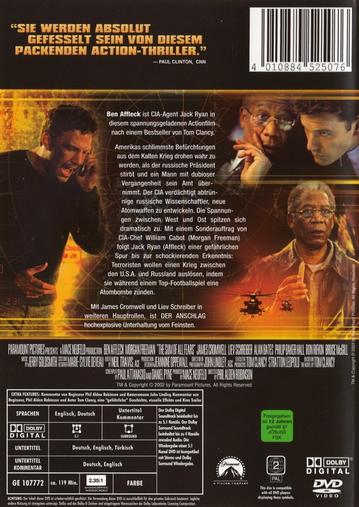 Es ist sicher keine leichte Aufgabe, Harrison Fords Platz als jedermanns Liebling einzunehmen. Umso bemerkenswerter ist es, dass Ben Affleck frischen Wind in Paramounts jüngste Tom-Clancy-Verfilmung bringt. Als CIA-Agent Jack Ryan, in der Rolle also, die durch Ford weltweit Berühmtheit erlangt hat, entwirrt Affleck ein Komplott ungeahnten Ausmasses. Während sich die Amerikaner und die Russen ins Abseits manövrieren, verwandelt eine neofaschistische Gruppierung grosse Teile Baltimores in eine nukleare Wüste und bringt die Welt an den Rand eines terroristischen Albtraums. Affleck verbindet in seiner Rolle messerscharfe Analytik mit dem unvoreingenommenen Blick des Neulings, während sein erfahrener Kollege (Morgan Freeman), ein alter Haudegen, die Schalter hinter den Kulissen umlegt. Das Resultat ist eine der besten Tom-Clancy-Verfilmungen bislang, von Phil Alden Robinson (dessen amüsanter Thriller Sneakers völlig unterbewertet wurde) geschickt inszeniert, aufgewertet durch eine hochkarätige Besetzung, auch und gerade in den Nebenrollen. Dazu kommt die ausgezeichnete Adaption durch Paul Attanasio (Donnie Brasco) und seinen Koautor Daniel Pyne, die sich durch reichlich Humor, Menschlichkeit und Spannung auszeichnet. Selbst der für gewöhnlich eher zurückhaltende Clancy hätte seinen Spass an diesem Film.