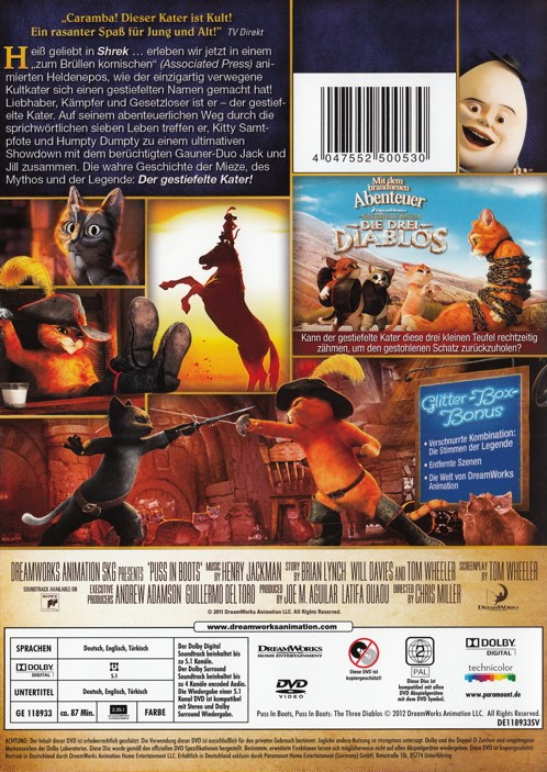 Heiss geliebt in Shrek ...erleben wir jetzt in einem ''zum Brüllen komischen'' (Associated Press) animierten Heldenepos, wie der einzigartig verwegene Kultkater sich einen gestiefelten Namen gemacht hat! Liebhaber, Kämpfer und Gesetzloser ist er - der gestiefelte Kater. Auf seinem abenteuerlichen Weg durch die sprichwörtlichen sieben Leben treffen er, Kitty Samtpfote und Humpty Dumpty zu einem ultimativen Showdown mit dem berüchtigten Gauner-Duo Jack und Jill zusammen. Die wahre Geschichte der Mieze, des Mythos und der Legende: Der gestiefelte Kater!