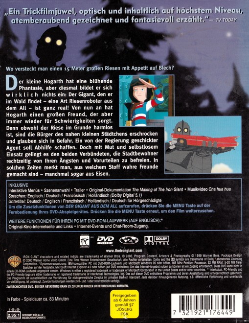 Wo versteckt man einen 15 Meter grossen Riesen mit Appetit auf Blech? Der kleine Hogarth hat eine blühende Phantasie, aber diesmal bildet er sich wirklich nichts ein: Beim Spielen im Wald entdeckt er einen riesigen Roboter, der aus dem Weltall auf die Erde gefallen ist - und der ist ganz real! Von nun an hat Hogarth einen grossen Freund, der aber immer wieder für Schwierigkeiten sorgt. Denn obwohl der Riese im Grunde harmlos ist, sind die Bürger des nahen kleinen Städtchens erschrocken und glauben sich in Gefahr. Ein von der Regierung geschickter Agent soll Abhilfe schaffen. Doch mit Mut und selbstlosem Einsatz gelingt es den beiden Verbündeten, die Stadtbewohner rechtzeitig von Ihren Ängsten und Vorurteilen zu befreien. In solchen Zeiten merkt man, aus welchem Stoff wahre Freunde gemacht sind - manchmal sogar aus Eisen.