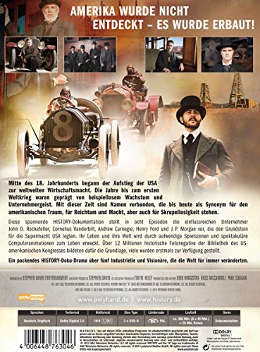 Amerika wurde nicht entdeckt - es wurde erbaut! Mitte des 18. Jahrhunderts begann der Aufstieg der USA zur weltweiten Wirtschaftsmacht. Die Jahre bis zum ersten Weltkrieg waren geprägt von beispiellosem Wachstum und Unternehmergeist. Mit dieser Zeit sind Namen verbunden, die bis heute als Synonym für den amerikanischen Traum, für Reichtum und Macht, aber auch für Skrupellosigkeit stehen. Diese spannende HISTORY-Dokumentation stellt in 8 Episoden die einflussreichen Unternehmer John D. Rockefeller, Cornelius Vanderbilt, Andrew Carnegie, Henry Ford und J.P. Morgan vor, die den Grundstein für die Supermacht USA legten. Ihr Leben und ihre Welt wird durch aufwendige Spielszenen und spektakuläre Computeranimationen zum Leben erweckt. Über 12 Millionen historische Fotonegative der Bibliothek des US-amerikanischen Kongresses bildeten dafür die Grundlage, viele wurden erstmals zur Verfügung gestellt. Ein packendes HISTORY-Doku-Drama über fünf Industrielle und Visionäre, die die Welt für immer veränderten.