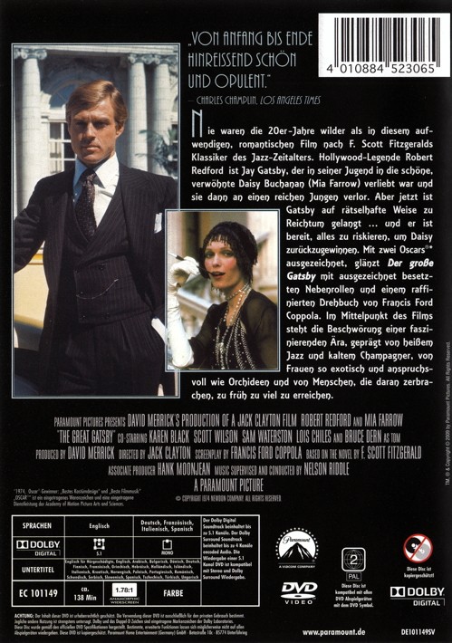 Nie waren die 20er Jahre wilder als in diesem aufwändigen, romantischen Film nach F. Scott Fitzgeralds Klassiker des Jazz-Zeitalters. Hollywood-Legende Robert Redford ist Jay Gatsby, der in seiner Jugend in die schöne, verwöhnte Daisy Buchanan verliebt war und sie dann an einen reichen Jungen verlor. Aber jetzt ist Gatsby auf rätselhafte Weise zu Reichtum gelangt...und er ist bereit, alles zu riskieren, um Daisy zurückzugewinnen. Mit zwei Oscars ausgezeichnet, glänzt der große Gatsby mit ausgezeichnet besetzten Nebenrollen und einem raffinierten Drehbuch von Francis Ford Coppola. Im Mittelpunkt des Films steht die Beschwörung einer faszinierenden Ära, geprägt von heißem Jazz und kaltem Champagner, von Frauen so exotisch und anspruchsvoll wie Orchideen und von Menschen, die daran zerbrachen, zu früh zu viel zu erreichen.