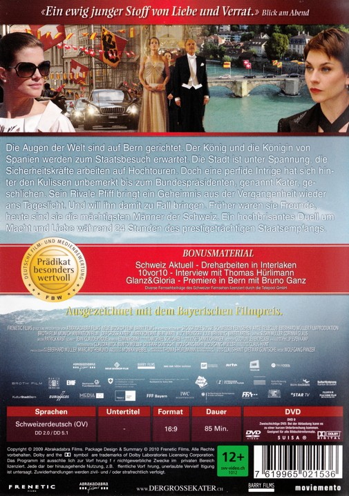 Die Umfragewerte für den Schweizer Bundespräsidenten, genannt "Kater", sind im Keller. Und sein Sohn ist schwer an Krebs erkrankt. Zur Aufpolierung von Katers Image soll der Besuch des spanischen Königspaars mit Glanz und Gloria und militärischen Ehren dienen. Als durch eine Intrige des Fraktionsvorsitzenden die Königin in der Krebsklinik für Kinder Tränen vergießen soll, glaubt Katers Ehefrau an einen Werbegag und sorgt beim Staatsdinner für einen Eklat. Amt und Ehe stehen auf dem Spiel.