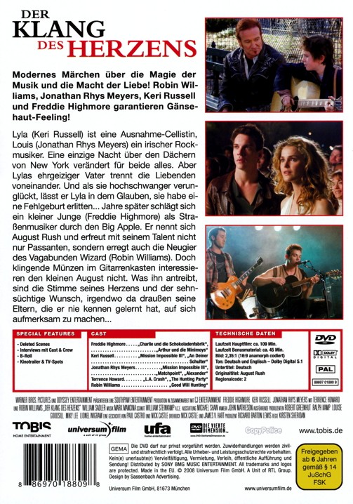 Lyla ist eine Ausnahme-Cellistin, Louis ein irischer Rockmusiker. Eine einzige Nacht über den Dächern von New York verändert für beide alles. Aber Lylas ehrgeiziger Vater trennt die Liebenden voneinander. Und als sie hochschwanger verunglückt, lässt er Lyla in dem Glauben, sie habe eine Fehlgeburt erlitten... Jahre später schlägt sich ein kleiner Junge als Strassenmusiker durch den Big Apple. Er nennt sich August Rush und erfreut mit seinem Talent nicht nur Passanten, sondern erregt auch die Neugier des Vagabunden Wizard. Doch klingende Münzen im Gitarrenkasten interessieren den kleinen August nicht. Was ihn antreibt sind die Stimme seines Herzens und der sehnsüchtige Wunsch, irgendwo da draussen seine Eltern, die er nie kennen gelernt hat, auf sich aufmerksam zu machen...