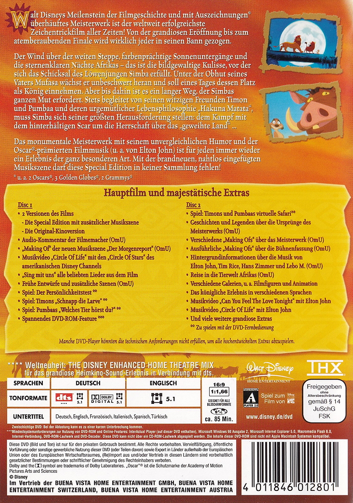 Disneys Meisterwerk „Der König der Löwen“ ist bis heute der weltweit erfolgreichste Zeichentrickfilm aller Zeiten. Er erzählt die bewegende Geschichte des kleinen, tapferen Löwen Simba, der seinen Platz im „Kreis des Lebens“ sucht. Mit seinem unvergleichlichen Humor, der Oscar®-prämierten Musik (1994: Beste Filmmusik, Bester Song „Kann es wirklich Liebe sein“) und einmaligem Bonusmaterial ist der zeitlose Klassiker ein Meilenstein der Filmgeschichte und bietet aussergewöhnlichen Filmspass auf Blu-ray Disc für Gross und Klein!