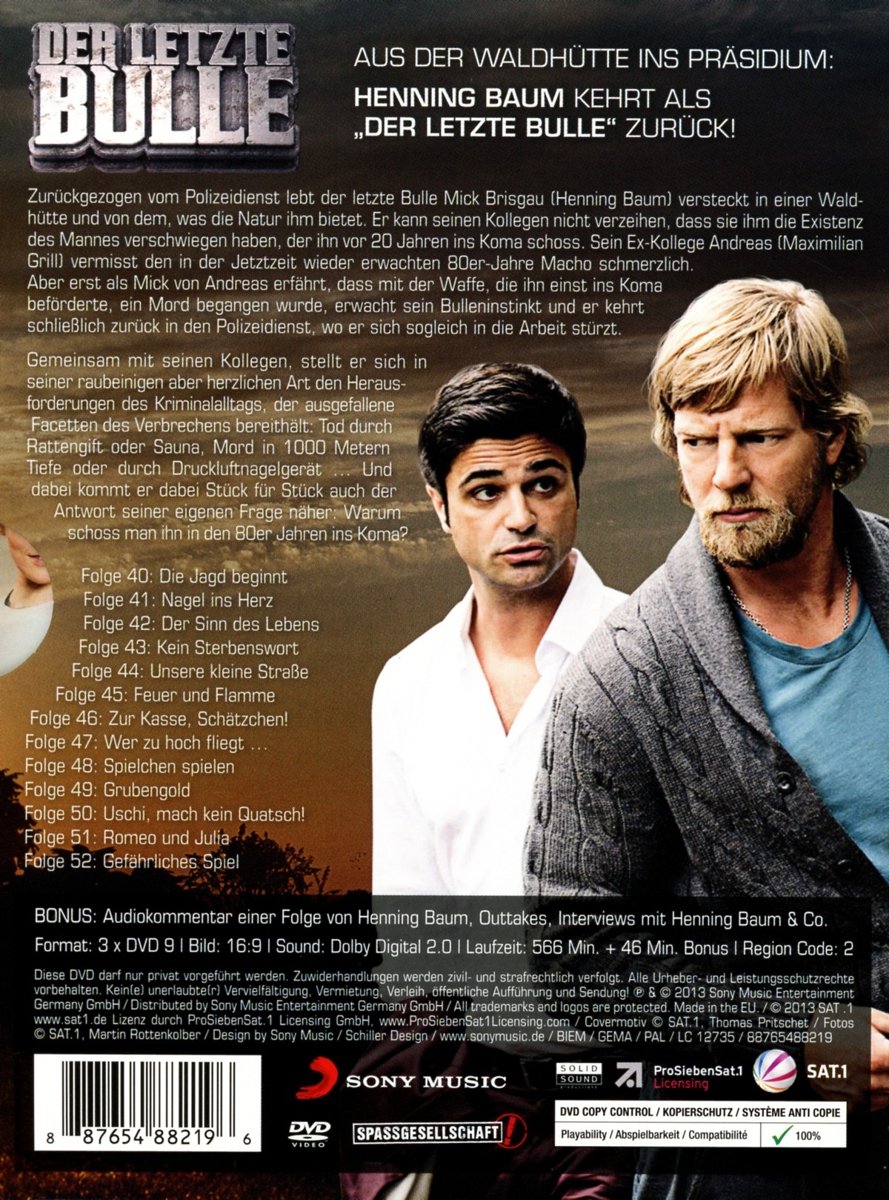 „Der letzte Bulle“ ist zurück! Auf geht‘s in die vierte Runde für die SAT. 1-Erfolgsserie Zurückgezogen vom Polizeidienst lebt Mick (Henning Baum) versteckt in einer Waldhütte und von dem, was die Natur ihm bietet. Er kann seinen Kollegen nicht verzeihen, dass sie ihm die Existenz des Mannes verschwiegen haben, der ihn vor 20 Jahren ins Koma schoss. Sein Ex-Kollege Andreas (Maximilian Grill) vermisst Mick schmerzlich, denn dessen Nachfolger (Daniel Zillmann) ist ein Klugscheisser vor dem Herrn. Aber erst, als Mick von Andreas erfährt, dass mit der Waffe, die ihn einst ins Koma beförderte, ein Mord begangen wurde, erwacht sein Bulleninstinkt. Im Revier bekommt Psychologin Tanja (Proschat Madani) mit der neuen Controllerin Steffi (Franziska Weisz) in puncto Mick eine unbeliebte Konkurrenz …