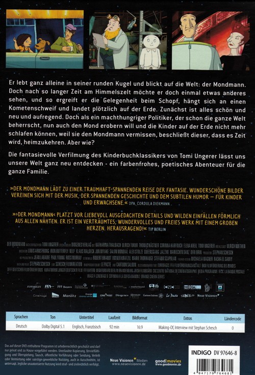 Es gibt ihn wirklich, den Mondmann. Er ist ein sehr neugieriges Wesen und möchte nur zu gern wissen, wie es auf der Erde so ist. Er nimmt den nächsten Kometen und beginnt ein tolles Abenteuer: Blumen, Tiere, Düfte lernt er auf der Erde kennen - und den schlauen Erfinder Bunsen van der Dunkel. Der hat so was wie den Mondmann noch nie gesehen und ist ganz fasziniert. Die beiden werden Freunde. Nur der mächtige Präsident hält den Mondmann für eine gefährliche Bedrohung. Er ist das Oberhaupt der Erde und möchte nun auch den Mond erobern und unbedingt den Mondmann einfangen. Dafür soll ihm der Erfinder van der Dunkel eine Rakete bauen. Der Mondmann hat sich unterdessen bei dem etwas verrückten Erfinder versteckt und hilft fleißig beim Raketenbau. Doch eben nicht für den Präsidenten, sondern für seine Reise nach Hause. Denn die Kinder vermissen den Mondmann schon. Sie können ohne sein Leuchten am Himmel gar nicht mehr schlafen. Auch der Mondmann hat Heimweh und möchte wieder für die Kinder da sein. Die fantasievolle Verfilmung des Buchklassikers vom weltbekannten Erfolgsautor Tomi Ungerer lässt uns unsere Welt ganz neu entdecken. »Der Mondmann« ist ein farbenfrohes, poetisches Abenteuer für die ganze Familie – mit den Stimmen von Katharina Thalbach (als »Mondmann«), Ulrich…