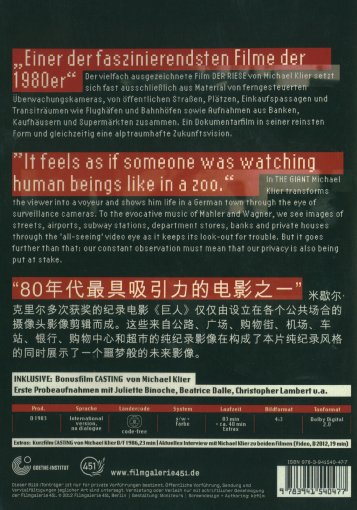 Der vielfach ausgezeichnete Film 'Der Riese' von Michael Klier setzt sich fast ausschließlich aus Material von ferngesteuerten Überwachungskameras, von öffentlichen Straßen, Plätzen, Einkaufspassagen und Transiträumen wie Flughäfen und Bahnhöfen sowie Aufnahmen aus Banken, Kaufhäusern und Supermärkten zusammen. Ein Dokumentarfilm in seiner reinsten Form und gleichzeitig eine alptraumhafte Zukunftsvision.