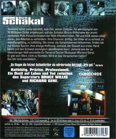 Niemand kennt seine Identität, sein Ziel, seinen Zeitplan. Für ein Kopfgeld von 70 Millionen Dollar angeheuert, soll der Schakal (Bruce Willis) einen der prominentesten Polit-Persönlichkeiten der Welt töten. FBI und KGB setzen alles daran, das Attentat zu verhindern. Ihre Chancen: dürftig. Der Killer ist zu schnell, zu wandlungsfähig, zu kaltblütig. Wo immer die Geheimdienste hinkommen, finden sie nur blutige Spuren. Ihre einzige Hoffnung: Jemand, der Gewalt aus erster Hand kennt und den Schakal womöglich identifizieren kann. Jemand wie der zu lebenslanger Haft verurteilte Ex-Terrorist Declan Mulqueen (Richard Gere). Er gibt sein Wort, nicht zu flüchten. Wird er das Versprechen halten? Die Uhr tickt unerbittlich...