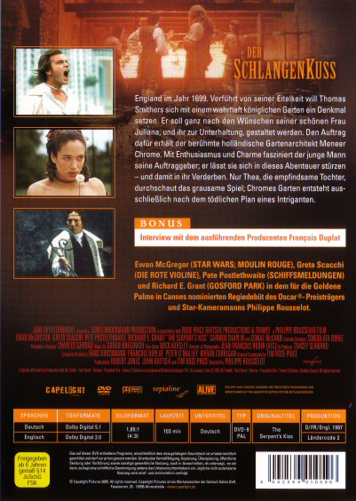 England im Jahr 1699: Verführt von seiner Eitelkeit will Thomas Smithers sich mit einem wahrhaft königlichen Garten ein Denkmal setzen. Er soll ganz nach den Wünschen seiner schönen Frau Juliana, und ihr zur Unterhaltung, gestaltet werden. Den Auftrag dafür erhält der berühmte holländische Gartenarchitekt Meneer Chrome. Mit Enthusiasmus und Charme fasziniert der junge Mann seine Auftraggeber; er läßt sich in dieses Abenteuer stürzen - und damit in ihr Verderben. Nur Thea, die empfindsame Tochter, durchschaut das grausame Spiel: Chromes Garten entsteht ausschließlich nach dem tödlichen Plan eines Intriganten...