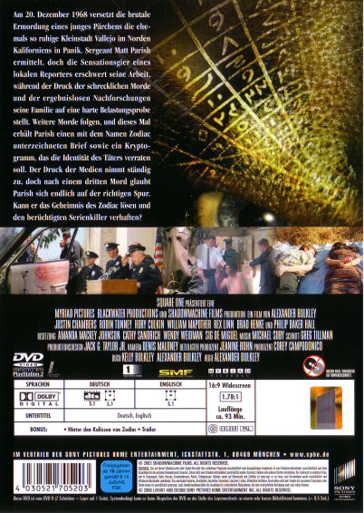 Am 20. Dezember 1968 versetzt die brutale Ermordung eines junges Pärchens die ehemals so ruhige Kleinstadt Vallejo im Norden Kaliforniens in Panik. Sergeant Matt Parish ermittelt, doch die Sensationsgier eines lokalen Reporters erschwert seine Arbeit, während der Druck der schrecklichen Morde und der ergebnislosen Nachforschungen seine Familie auf eine harte Belastungsprobe stellt. Weitere Morde folgen, und dieses Mal erhält Parish einen mit dem Namen Zodiac unterzeichneten Brief sowie ein Kryptogramm, das die Identität des Täters verraten soll. Der Druck der Medien nimmt ständig zu, doch nach einem dritten Mord glaubt Parish sich endlich auf der richtigen Spur. Kann er das Geheimnis des Zodiac lösen und den berüchtigten Serienkiller verhaften?