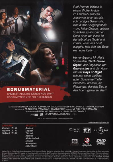 Fünf Fremde bleiben in einem Wolkenkratzer im Fahrstuhl stecken. Jeder von ihnen hat ein schmutziges Geheimnis, eine dunkle Vergangenheit – und keine Chance, seinem Schicksal zu entkommen. Denn einer von ihnen ist der leibhaftige Teufel und immer, wenn das Licht ausgeht, holt sich das Böse ein neues Opfer...
