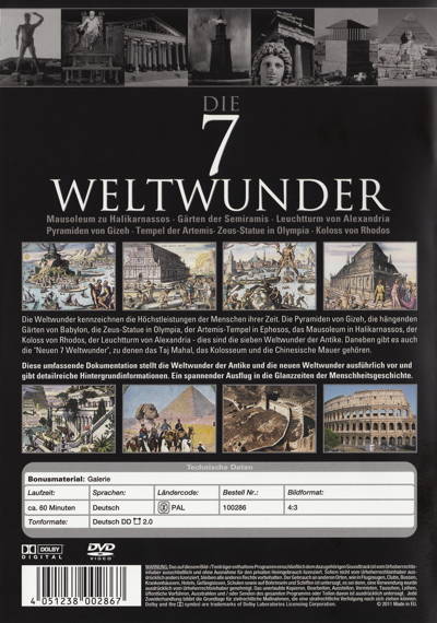 Diese umfassende Dokumentation stellt die Weltwunder der Antike und die neuen Weltwunder ausführlich vor und gibt detailreiche Hintergrundinformationen. Ein spannender Ausflug in die Glanzzeiten der Menschheitsgeschichte.