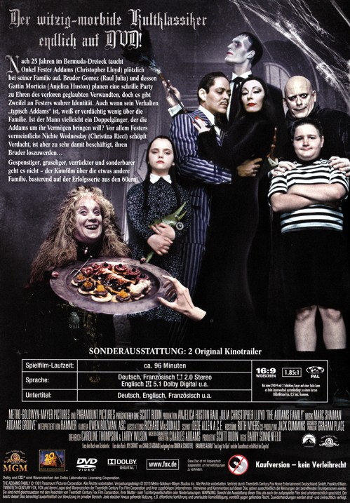 Die Kinderchen spielen vegnügt mit Fallbeil, elektrischem Stuhl und Armbrust. Mama Morticia (Anjelica Huston) lässt sich zur Feier des Tages ein wenig foltern. Und Papa Gomez (Raul Julia) macht gerade den Anwalt fertig. Dazwischen krabbelt, wie immer auf flinken Fingern, das Eiskalte Händchen durch die Villa. Normaler, schwarzer Addams-Alltag. Doch nun will sich ein Gauner das Familienvermögen unter den Nagel reissen. Die Addams werden böse wie nie zuvor... Addams Family. Worauf Millionen gewartet haben - die spektakulärtsten Abenteuer der legendären Schreckensfamilie. Toller Horror-Spass für Jung und Alt.