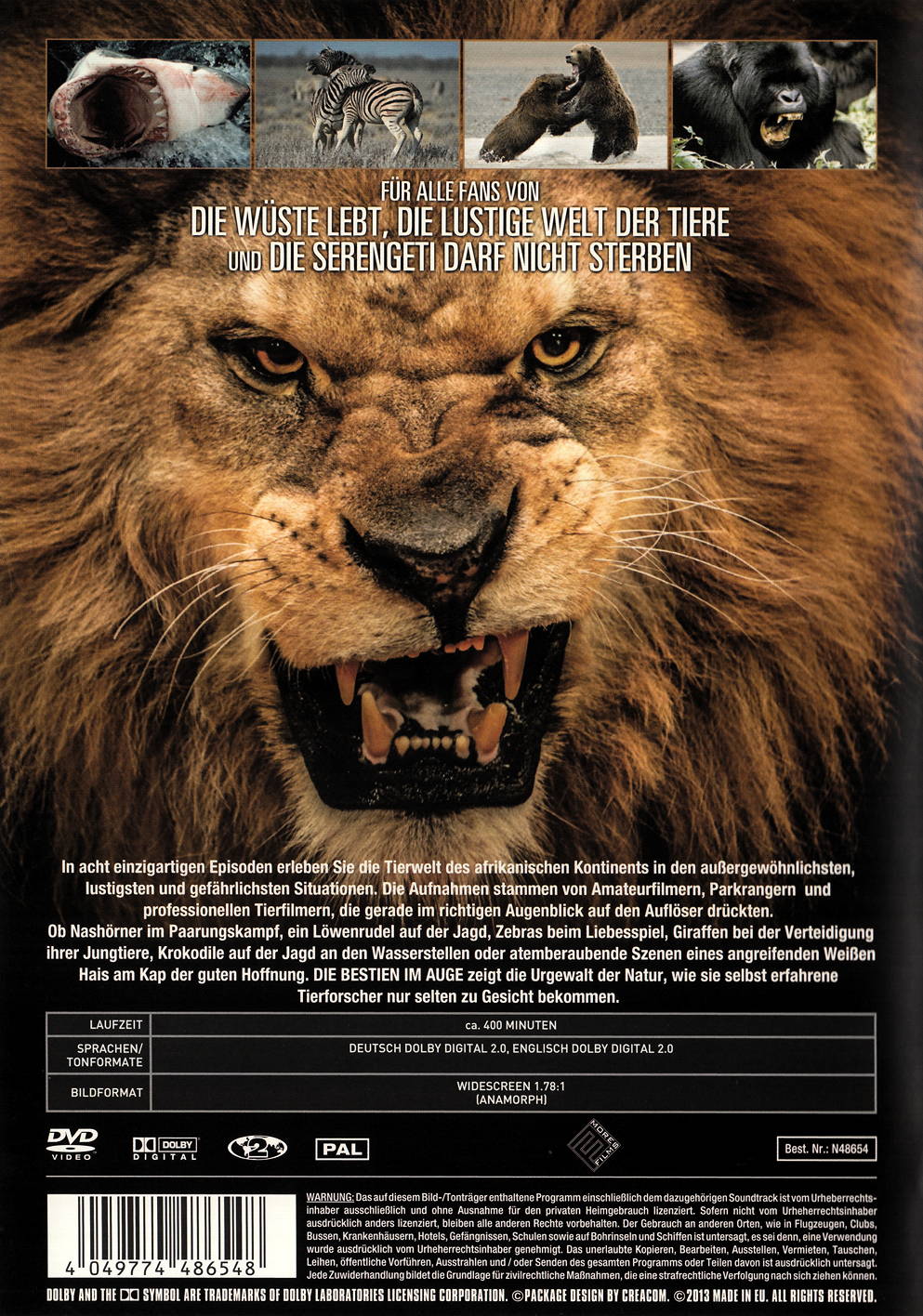In acht einzigartigen Episoden erleben Sie die Tierwelt des afrikanischen Kontinents in den außergewöhnlichsten, lustigsten und gefährlichsten Situationen. Die Aufnahmen stammen von Amateurfilmern, Parkrangern und professionellen Tierfilmern, die gerade im richtigen Augenblick auf den Auflöser drückten. Ob Nashörner im Paarungskampf, ein Löwenrudel auf der Jagd, Zebras beim Liebesspiel, Giraffen bei der Verteidigung ihrer Jungtiere, Krokodile auf der Jagd an den Wasserstellen oder atemberaubende Szenen eines angreifenden Weißen Hais am Kap der guten Hoffnung. DIE BESTIEN IM AUGE zeigt die Urgewalt der Natur, wie sie selbst erfahrene Tierforscher nur selten zu Gesicht bekommen.